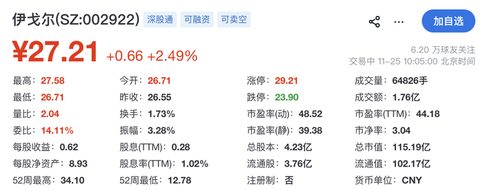 截至发稿时,伊戈尔A股报27.21元,涨2.49%,总市值约115.19亿元。