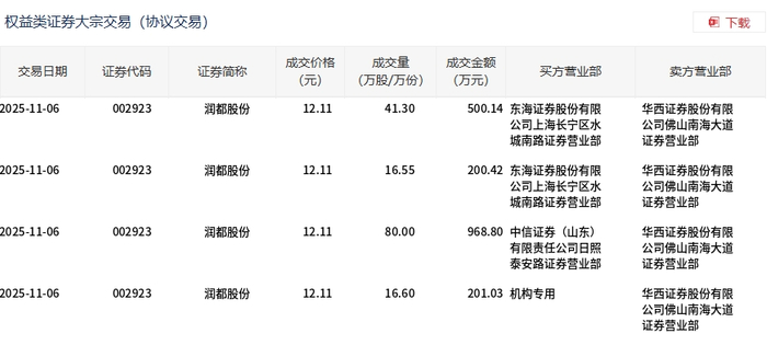 11月6日,润都股份大宗交易成交154.45万股,成交额1870.39万元,占当日总成交额的26.95%,成交价12.11元,较市场收盘价13.3元折价8.95%。