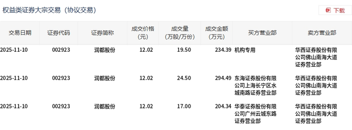 11月10日,润都股份大宗交易成交61万股,成交额733.22万元,占当日总成交额的10.13%,成交价12.02元,较市场收盘价13.6元折价11.62%。