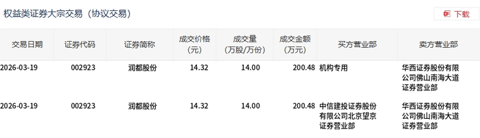 3月19日,润都股份大宗交易成交28万股,成交额400.96万元,占当日总成交额的5.32%,成交价14.32元,较市场收盘价15.69元折价8.73%。