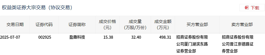盈趣科技今日大宗交易折价成交32.4万股,成交额498.31万元