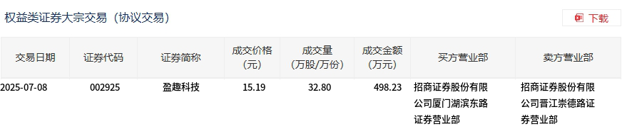 盈趣科技今日大宗交易折价成交32.8万股,成交额498.23万元