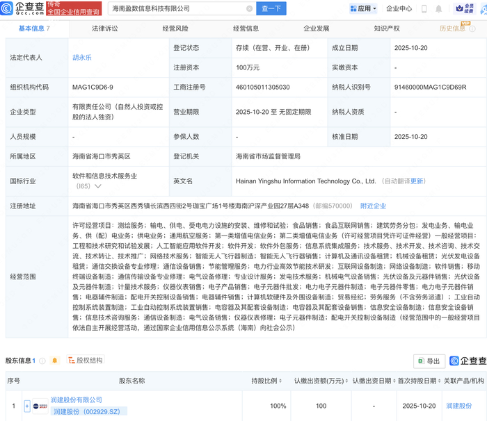 企查查APP显示,近日,海南启汇云信息科技有限公司、海南盈数信息科技有限公司成立,法定代表人分别为韦闯、胡永乐,经营范围均包含:人工智能应用软件开发;软件开发等。企查查股权穿透显示,二者皆由润建股份(002929)全资持股。
