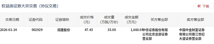 1月14日,润建股份大宗交易成交35万股,成交额1660.05万元,占当日总成交额的1.13%,成交价47.43元,较市场收盘价48.9元折价3.01%。