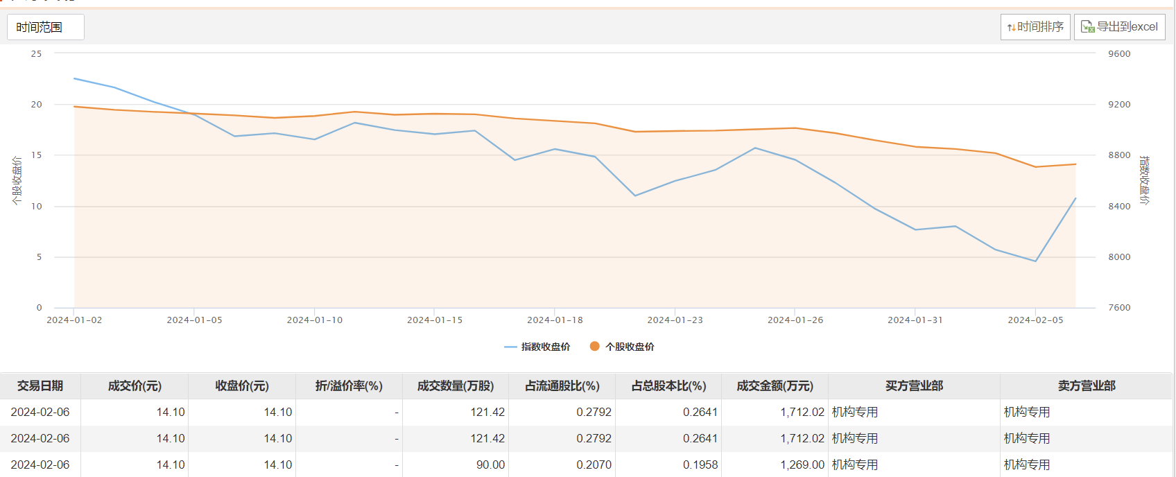 今日大宗交易成交332.84万股,成交额4693.04万元,占当日总成交额的47.86%,成交价14.1元,较市场收盘价持平。