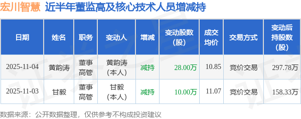 宏川智慧:11月4日高管黄韵涛减持股份合计28万股