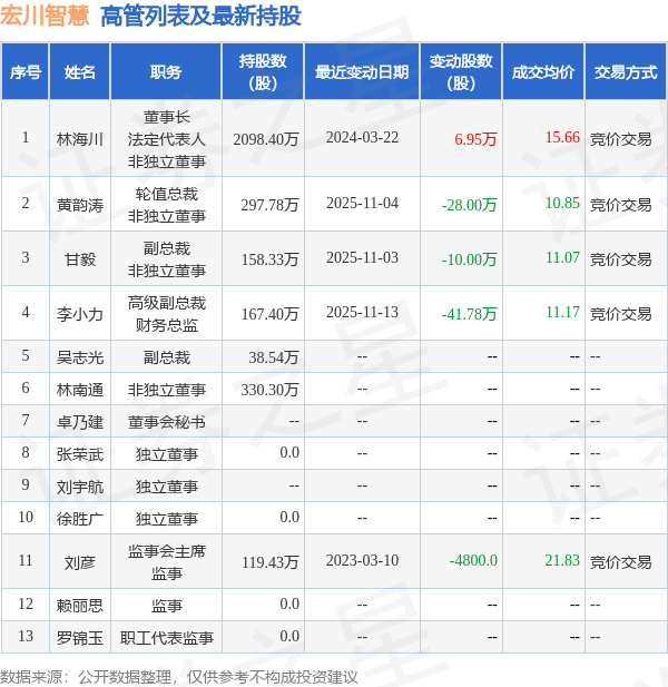宏川智慧的高管列表及最新持股情况如下: