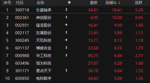 上证报中国证券网讯 12月30日早盘,机器人概念股震荡回升,截至10时19分,锋龙股份拉升封板,长盛轴承涨超18%,天玑科技、华工科技、恒为科技等涨幅居前。此前,神剑股份、东港股份涨停。
