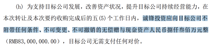 看点三,该笔交易中还出现了罕见的无偿捐赠承诺,即锋龙股份的原控股股东要在要交易完成后向上市公司无偿捐赠8300万元,用于支持公司发展、改善资产状况。