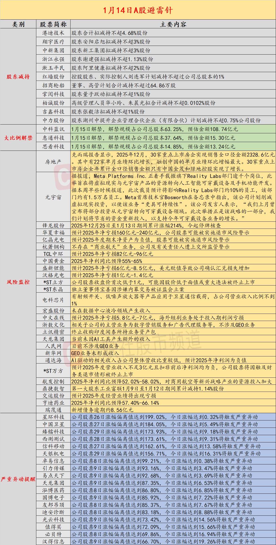 导读:财联社1月14日投资避雷针,近日,A股及海外市场潜在风险事件如下。国内经济信息方面包括:1)广期所调整碳酸锂期货相关合约交易手续费标准及交易限额;2)30家重点上市房企全年累计全口径销售金额仅中国金茂和绿地控股实现增长;公司方面重点关注包括:1)13连板锋龙股份2025年12月25日至1月13日期间累计涨幅214%,今起停牌核查;2)4连板杭萧钢构公告,不存在“商业航天”业务,公司及有关责任人遭上交所监管警示;海外市场重点关注包括:1)美股三大指数集体收跌,道指收跌0.8%;2)特朗普称取消与伊朗官员所有会面。