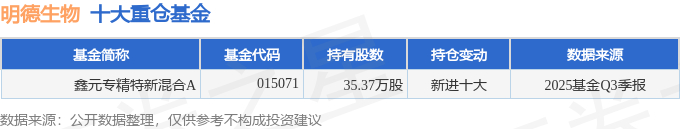 持有明德生物最多的基金为鑫元专精特新混合A,目前规模为0.97亿元,最新净值0.6552(10月31日),较上一交易日上涨0.24%,近一年上涨28.27%。该基金现任基金经理为陆杨。