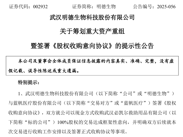 明德生物(002932)12月30日晚间公告,公司与蓝帆医疗股份有限公司(简称“蓝帆医疗”)签署《股权收购意向协议》,双方就公司以现金方式收购武汉必凯尔救助用品有限公司(简称“标的公司”)100%股权的交易达成框架性意向,并明确双方后续就本次交易进行收购工作安排以及签署正式收购协议等事项。本次交易完成后,标的公司将成为公司的全资子公司。