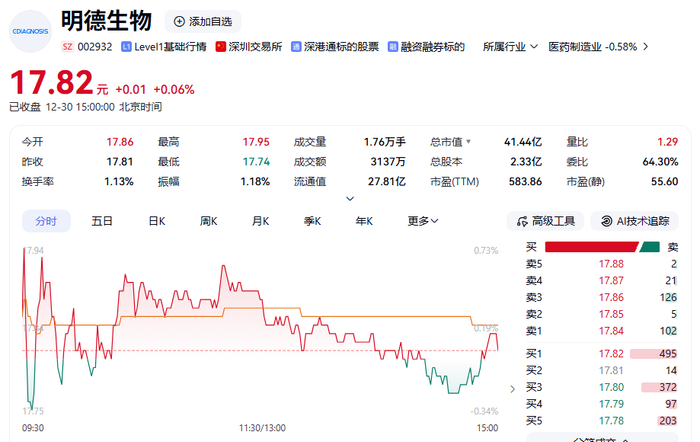 二级市场上,明德生物最新股价报17.82元/股,总市值为41.44亿元。