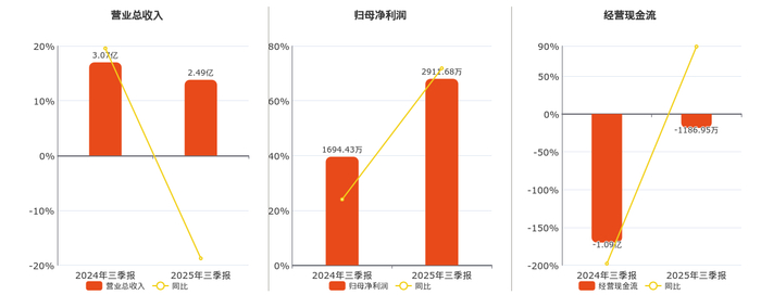 公司营业总收入为2.49亿元。归母净利润为2911.68万元,较去年同报告期归母净利润增加1217.25万元,实现3年连续上涨,同比较去年同期上涨71.84%。经营活动现金净流入为-1186.95万元,在已披露的同业公司中排名第21,较去年同报告期经营活动现金净流入增加9725.50万元。