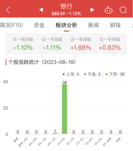 中国经济网北京6月19日讯今日,银行板块整体跌幅1.10%,其中0只股票上涨,2只股票平盘,39只股票下跌。