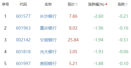 长沙银行、重庆银行、宁波银行、光大银行、贵阳银行位列涨幅榜后五位,涨幅分别为-2.60%、-1.96%、-1.94%、-1.93%、-1.88%。