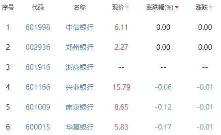 其中,中信银行、郑州银行、兴业银行、南京银行、华夏银行位列板块涨幅前五位,涨幅分别为0.00%、0.00%、-0.06%、-0.12%、-0.17%。