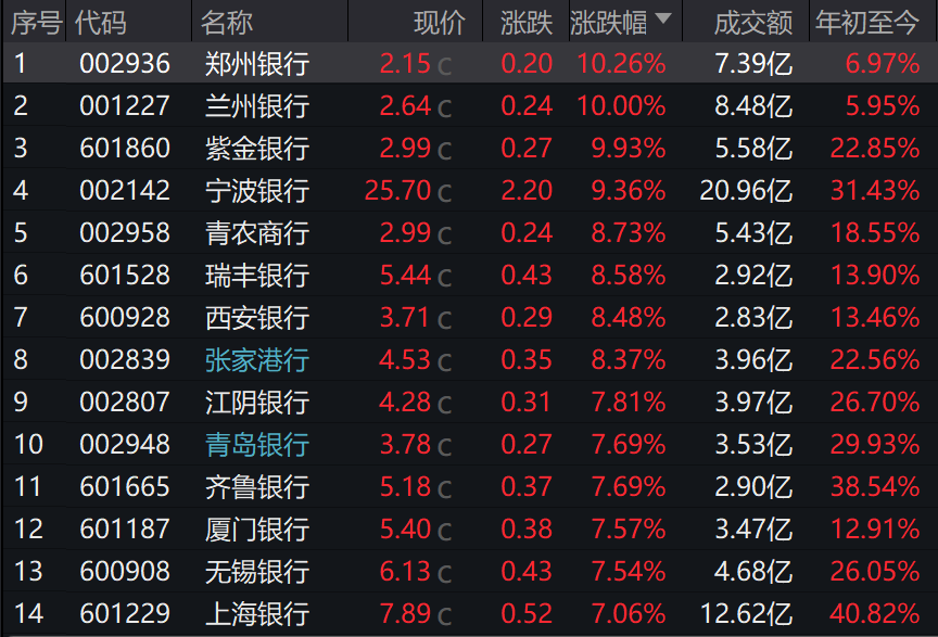 9月30日,A股银行板块走强,42只个股集体飘红。Wind数据显示,截至收盘,银行指数涨4.68%。其中,郑州银行、兰州银行涨停,报2.15元/股、2.64元/股,紫金银行、宁波银行均涨超9%,分别收涨9.93%、9.36%,报2.99元/股、25.07元/股,另外,青农商行、瑞丰银行、西安银行、张家港行均涨超8%。