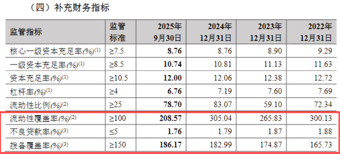 流动性管理方面,指标呈现“跳水式”下滑,风险隐患不容忽视。流动性覆盖率从2024年末的305.04%骤降至2025年三季度的208.57%,;流动性比例从83.07%降至78.70%,虽仍高于监管标准,但流动性储备的收缩态势明显。