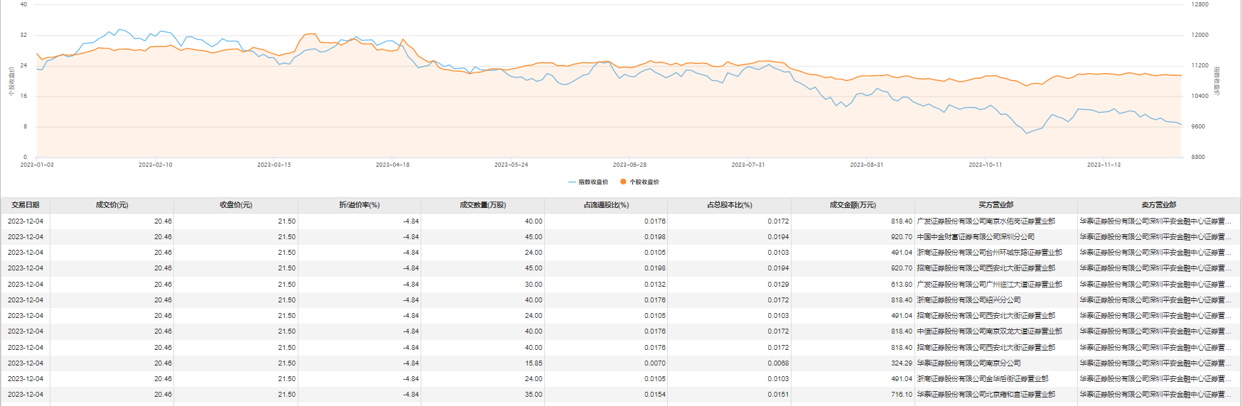 今日大宗交易成交402.85万股,成交额8242.31万元,占当日总成交额的29%,成交价20.46元,较市场收盘价折价4.84%。