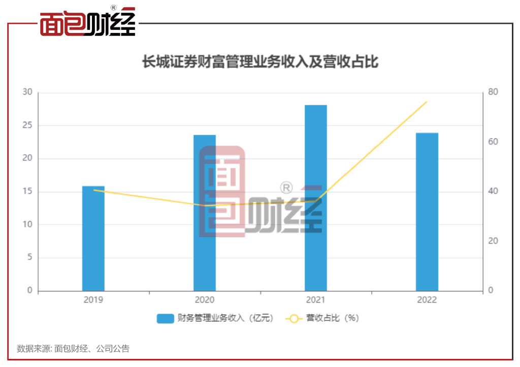 2022年,公司财富管理业务收入为23.9亿元,同比下降14.96%,但总营收占比由2021年的36.23%提升至2022年的76.43%,较上年增加40.2个百分点。