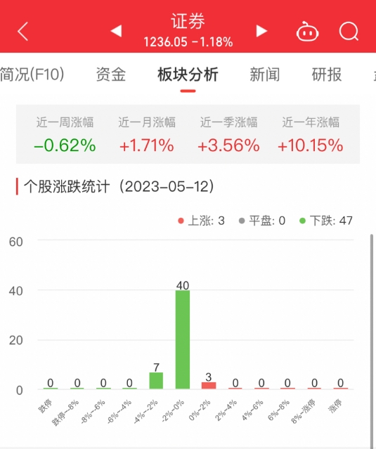 中国经济网北京5月12日讯今日,证券板块整体涨幅-1.18%,其中3只股票上涨,47只股票下跌。
