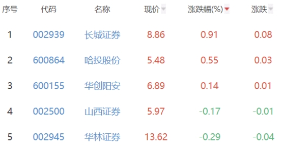 其中,长城证券、哈投股份、华创阳安、山西证券、华林证券位列板块涨幅前五位,涨幅分别为0.91%、0.55%、0.14%、-0.17%、-0.29%。