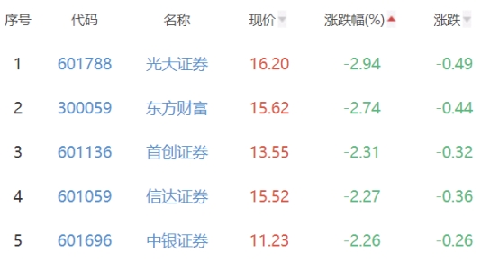 光大证券、东方财富、首创证券、信达证券、中银证券位列涨幅榜后五位,涨幅分别为-2.94%、-2.74%、-2.31%、-2.27%、-2.26%。