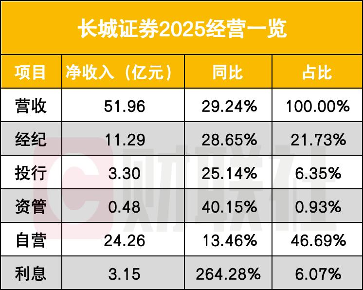 自营业务是长城证券第一大收入来源,公司2025年自营收入的营收占比为46.69%,该收入为24.26亿元,同比增13.46%;
