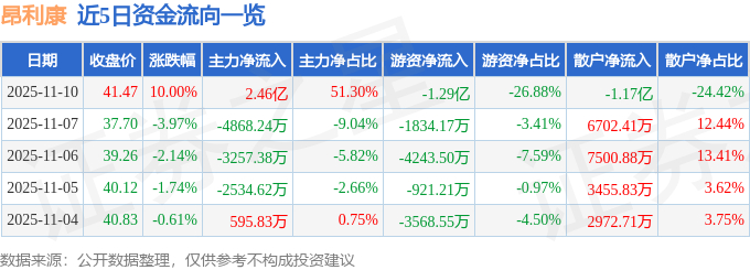 11月10日的资金流向数据方面,主力资金净流入2.46亿元,占总成交额51.3%,游资资金净流出1.29亿元,占总成交额26.88%,散户资金净流出1.17亿元,占总成交额24.42%。