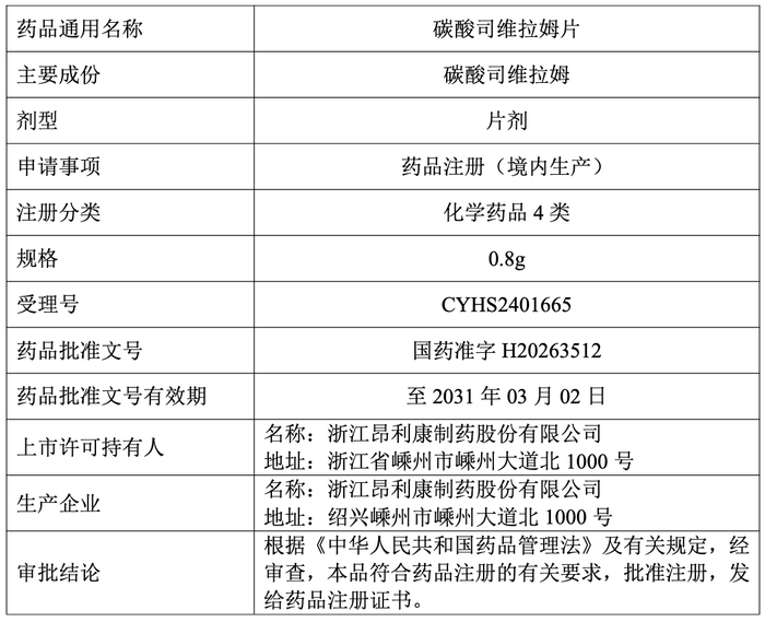 昂利康:获碳酸司维拉姆片药品注册证书,增强肾病领域竞争力