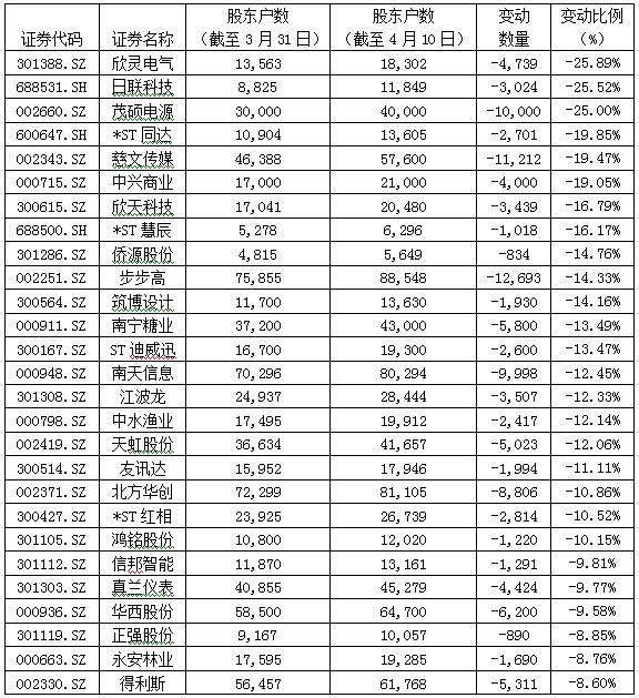 当中,欣灵电气(301388)、日联科技(688531)、茂硕电源(002660)、*ST同达(600647)、慈文传媒(002343)、中兴商业(000715)、欣天科技(300615)、*ST慧辰(688500)、侨源股份(301286)、步步高(002251)、筑博设计(300564)、南宁糖业(000911)、ST迪威迅(300167)、南天信息(000948)、江波龙(301308)、中水渔业(000798)、天虹股份(002419)、友讯达(300514)、北方华创(002371)、*ST红相(300427)、鸿铭股份(301105)等21家公司最新一期股东户数环比减少超过10%。