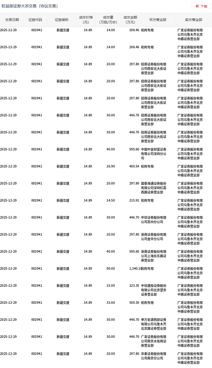 12月29日,新疆交建大宗交易成交785.25万股,成交额1.17亿元,占当日总成交额的20.92%,成交价14.89元,较市场收盘价16.51元折价9.81%。