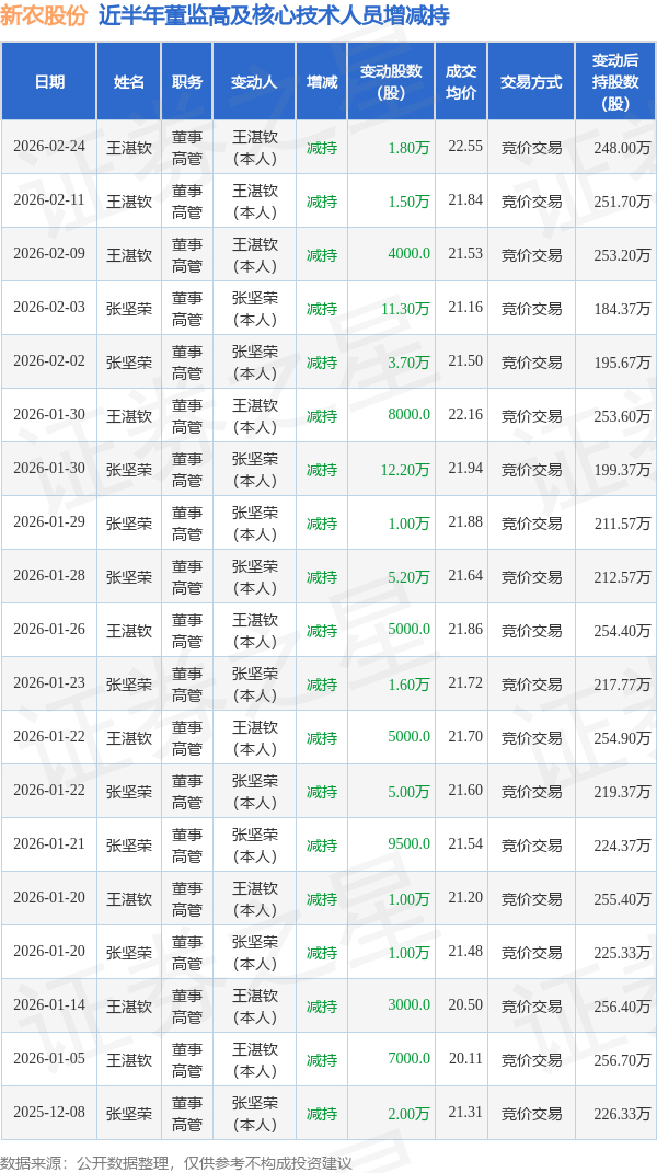 新农股份近半年内的董监高及核心技术人员增减持详情如下: