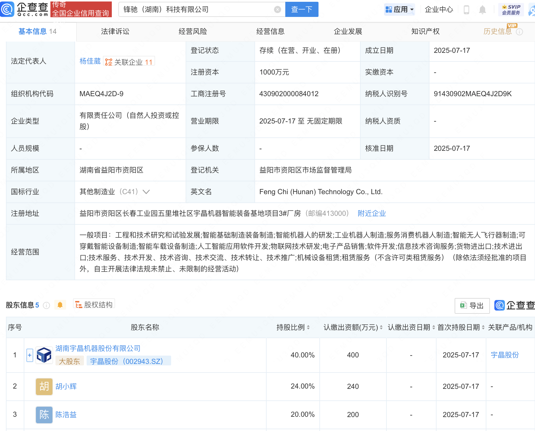 企查查APP显示,锋驰(湖南)科技有限公司成立,法定代表人为杨佳葳,经营范围包含:智能机器人的研发;工业机器人制造;服务消费机器人制造;智能无人飞行器制造等。企查查股权穿透显示,该公司由宇晶股份(002943)等共同持股。