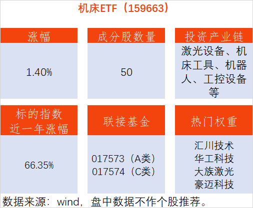 机床ETF(159663),紧密跟踪的中证机床指数,涵盖了我国制造业产业链中的关键一环——高端装备制造领域,涉及激光设备、机床工具、机器人、工控设备等行业,是新质生产力理念强调创新驱动与产业升级落地实践的核心阵地。其场外联接基金为,A类:017573;C类:017574。