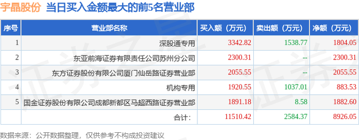 1月5日宇晶股份(002943)龙虎榜数据:机构净买入883.53万元,北向资金净买入1804.05万元