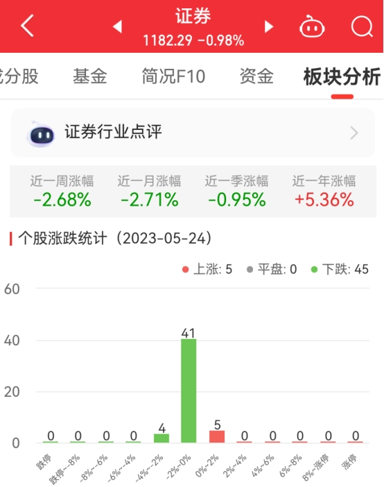 中国经济网北京5月24日讯今日,证券板块整体跌幅0.98%,其中5只股票上涨,45只股票下跌。