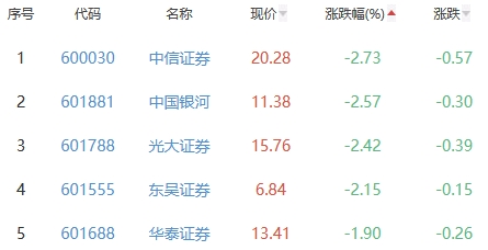 中信证券、中国银河、光大证券、东吴证券、华泰证券位列涨幅榜后五位,涨幅分别为-2.73%、-2.57%、-2.42%、-2.15%、-1.90%。