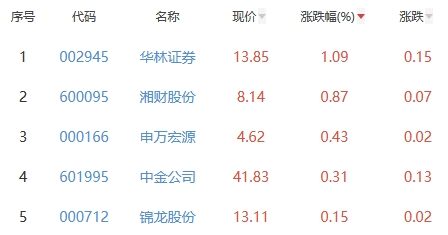 其中,华林证券、湘财股份、申万宏源、中金公司、锦龙股份位列板块涨幅前五位,涨幅分别为1.09%、0.87%、0.43%、0.31%、0.15%。