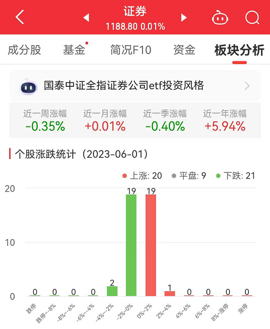 中国经济网北京6月1日讯 今日,证券板块整体涨幅0.01%,其中,20只股票上涨,9只股票平盘,21只股票下跌。