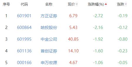 方正证券、哈投股份、中金公司、首创证券、申万宏源位列涨幅榜后五位,涨幅分别为-2.72%、-2.16%、-1.92%、-1.60%、-1.06%。