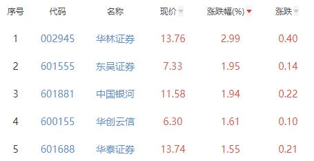 其中,华林证券、东吴证券、中国银河、华创云信、华泰证券位列板块涨幅前五位,涨幅分别为2.99%、1.95%、1.94%、1.61%、1.55%。
