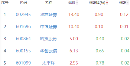 其中,华林证券、中银证券、哈投股份、华创云信和太平洋位列板块涨幅前五位,涨幅分别为0.90%、0.10%、-0.40%、-0.65%和-0.78%。