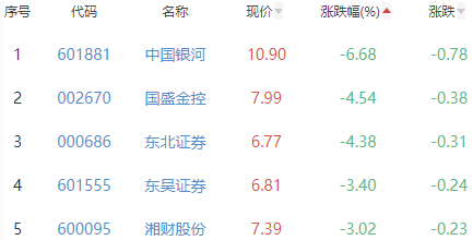 中国银河、国盛金控、东北证券、东吴证券和湘财股份位列涨幅榜后五位,涨幅分别为-6.68%、-4.54%、-4.38%、-3.40%和-3.02%。