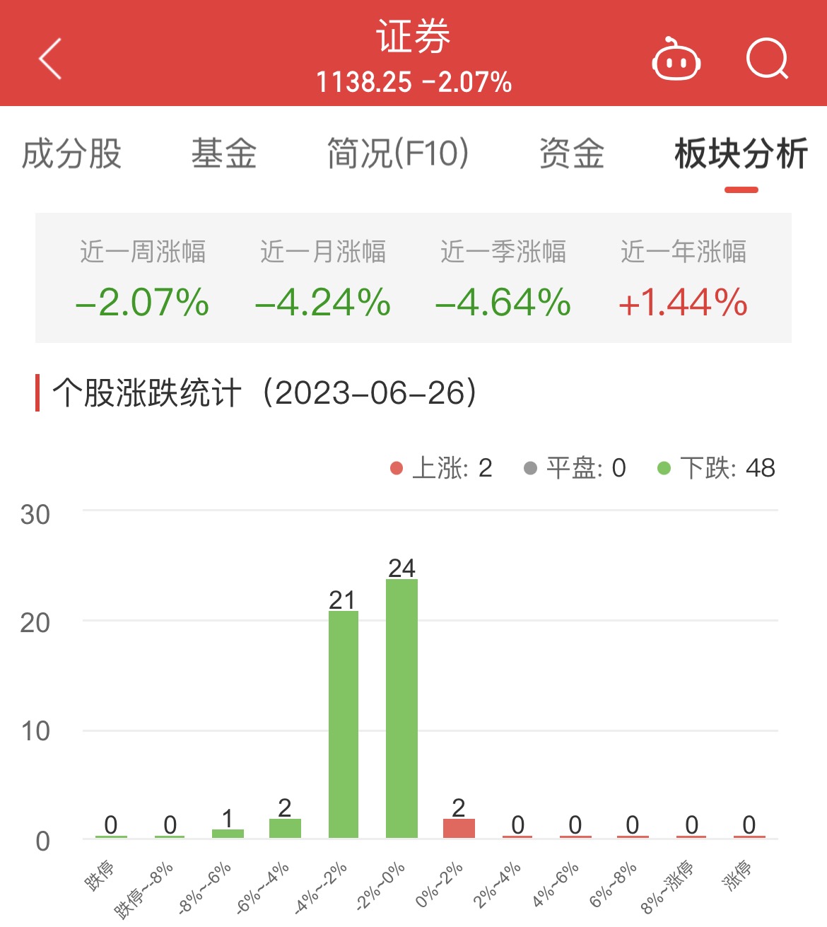 中国经济网北京6月26日讯今日,证券板块整体涨幅-2.07%,其中2只股票上涨,0只股票平盘,48只股票下跌。