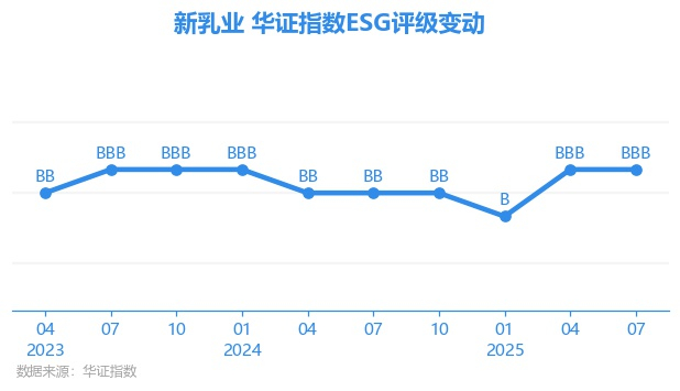 日前,华证指数公布了新一期(2025年7月31日)的ESG评级结果,新乳业(002946.SZ)获得BBB评级(华证指数评级为C起至AAA九档,C为最低档,AAA为其最高一级评级/AA为其第二档),上一期(2025年4月30日)ESG评级为BBB。本期ESG评级在156家食品行业A股上市公司中排名第26(上一期排名第25)。