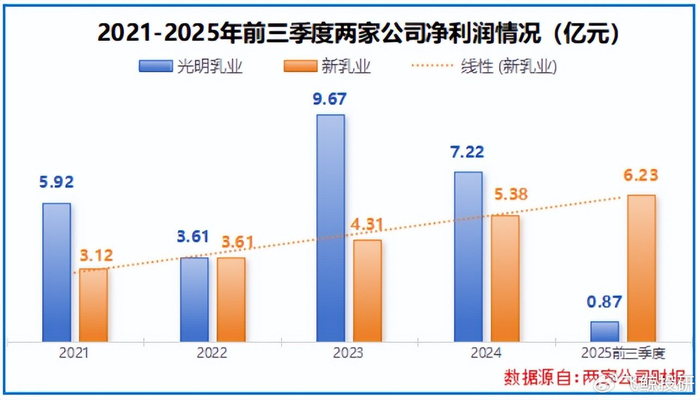 从业绩来看,2025年前三季度,光明乳业净利润仅8721万元,单三季度更是净亏1.3亿元。反观新乳业前三季度净利润达6.23亿元,同比增长31.48%。