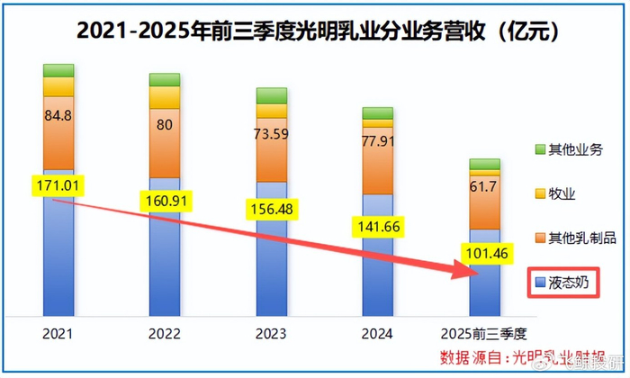 2021-2024年,其液态奶营收从171亿元跌到142亿元;2025年前三季度,更是同比下滑8.57%,只剩101亿元,也直接让公司净利润少了支撑。