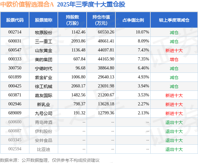 中欧价值智选混合A的前十大重仓股如下: